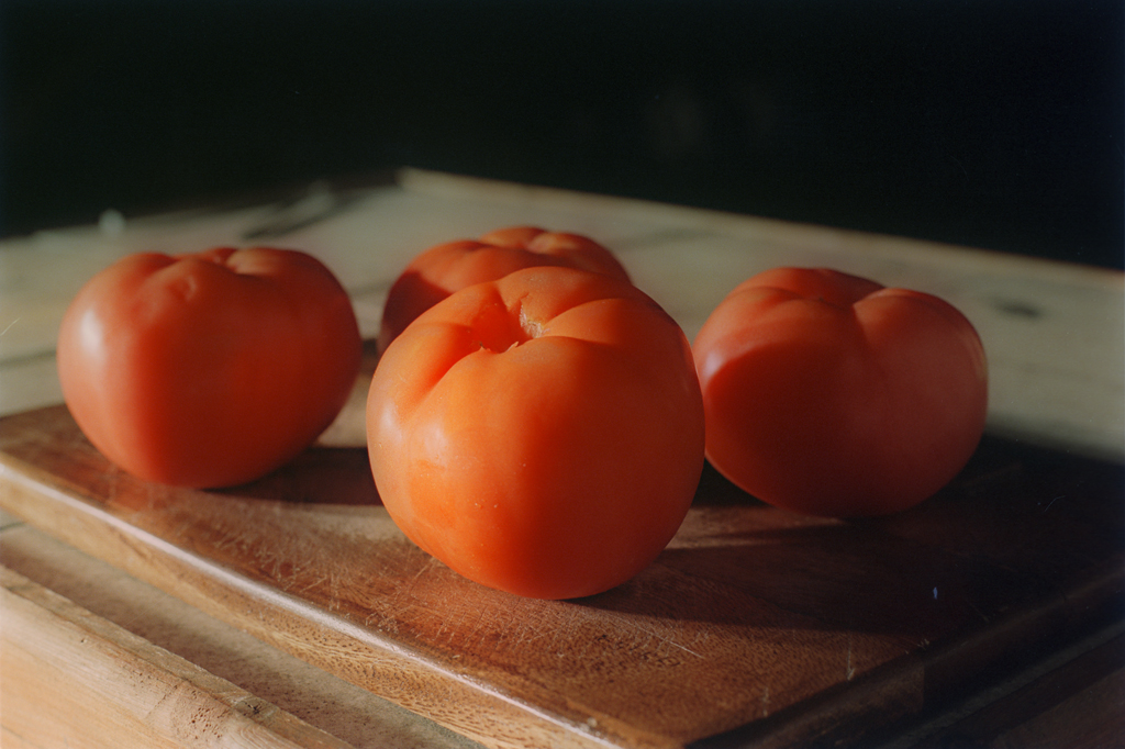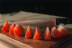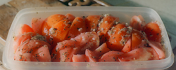 Cut each tomatoes into 8 slices. Place them into a container with a tight fitting lid. Neatness doesn't count - we're going to be shaking the container in a couple of steps.