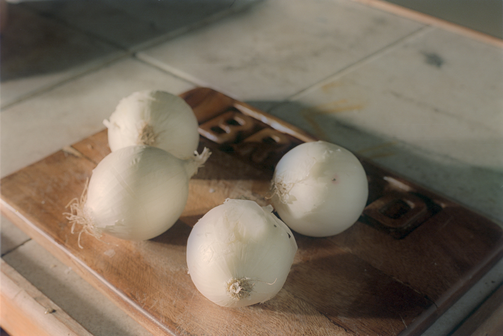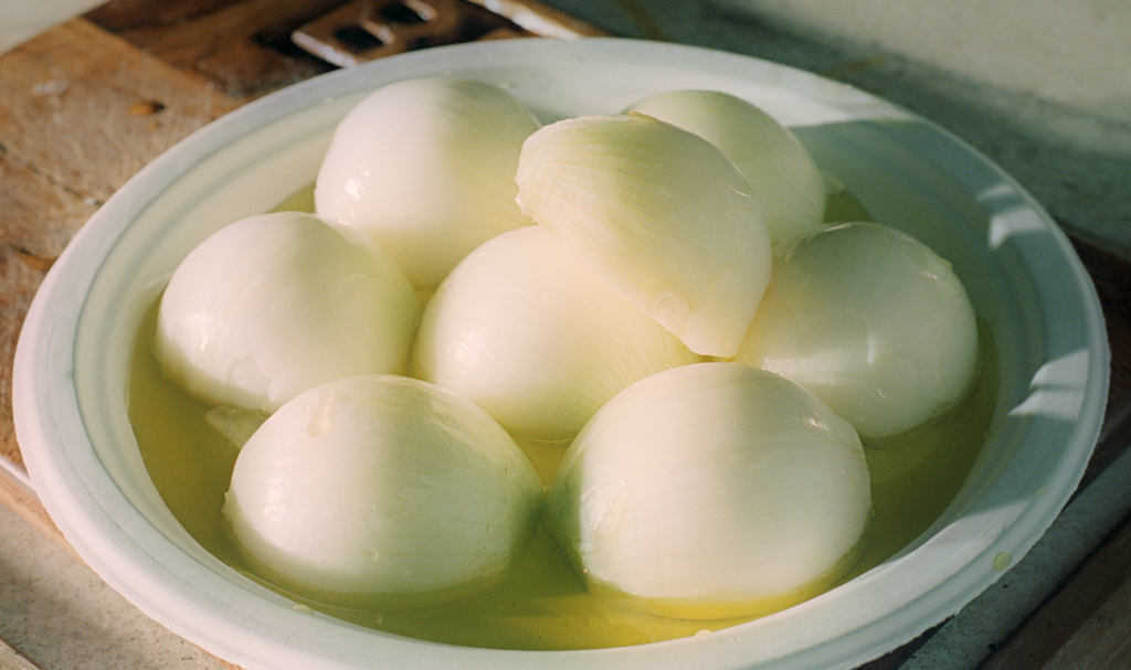 Peel the Onions and cut them in half. Place onions into a dish deep enough to hold 1/8" or so of olive oil. Pour olive oil over onions and let them soak face down while doing the rest of the prep work.