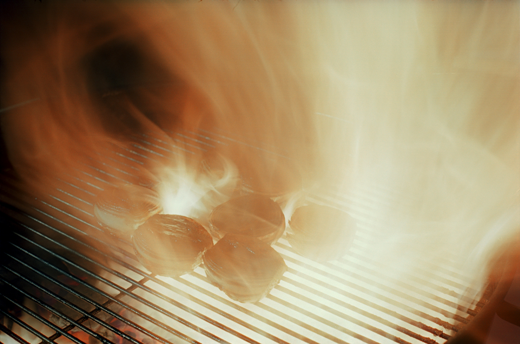 Place the onions on the grill, cut side down. I use tongs to place them. Use caution as the oil dripping onto the hot coals will cause flare-ups as pictured. Leave on grill about 90 seconds.