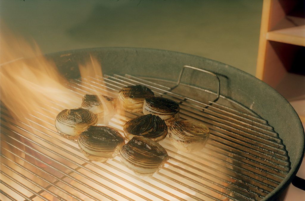 After 90 seconds, move the onions to the sides of the grill and leave them cut side up.