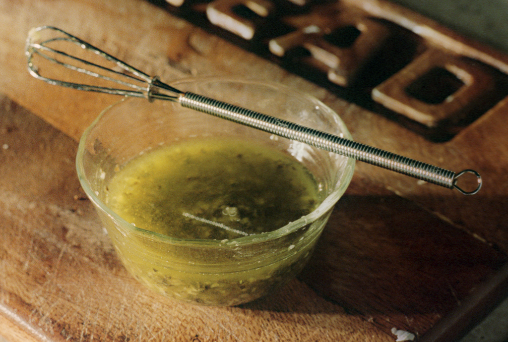 Put 1/3 cup Olive Oil into a small mixing bowl or dish. Add the Oregano and Basil. Press the garlic into the oil (or mince the garlic and add to the oil). Mix well with a small wisk or fork.