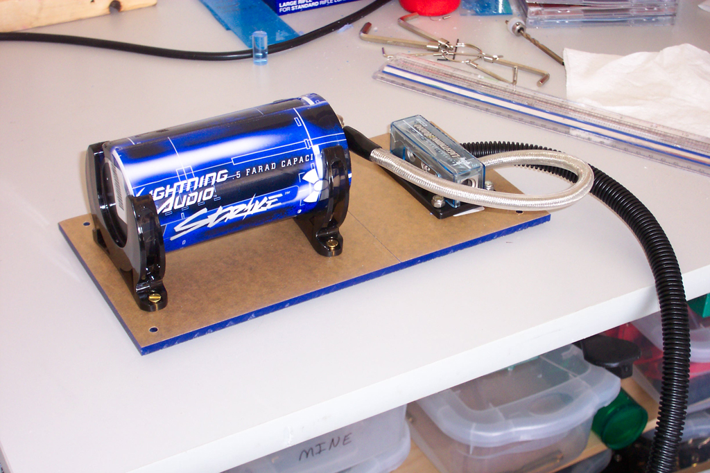 The ground from the capacitor will be re-routed to the same side of the block. I need to find a vise to bend the connector to 90 degrees.